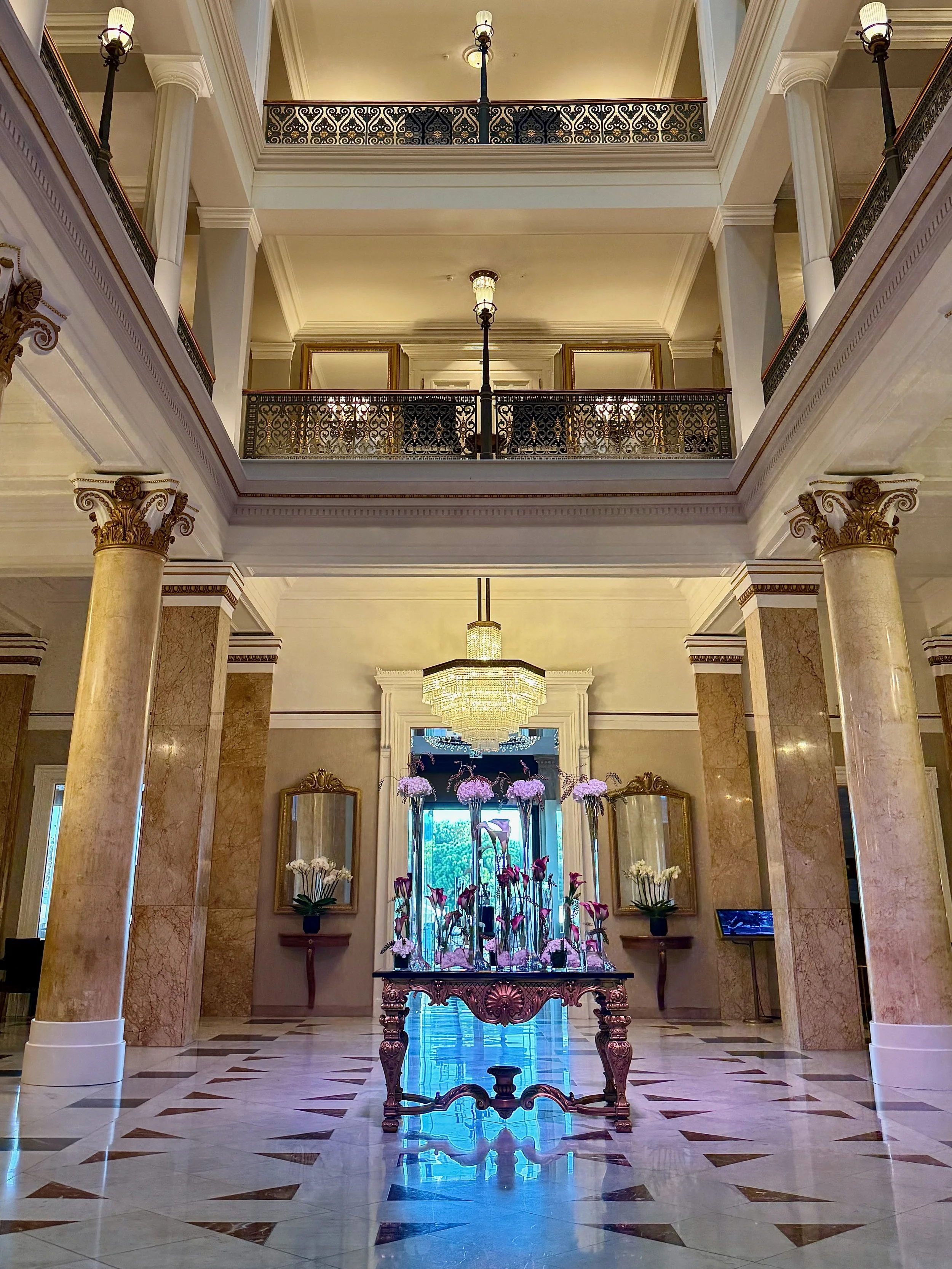 The lobby immediately evokes a grand European palace hotel, with high ceilings and generous corridors leading to the different wings of the property. The opulent design creates an atmosphere that feels composed rather than theatrical.