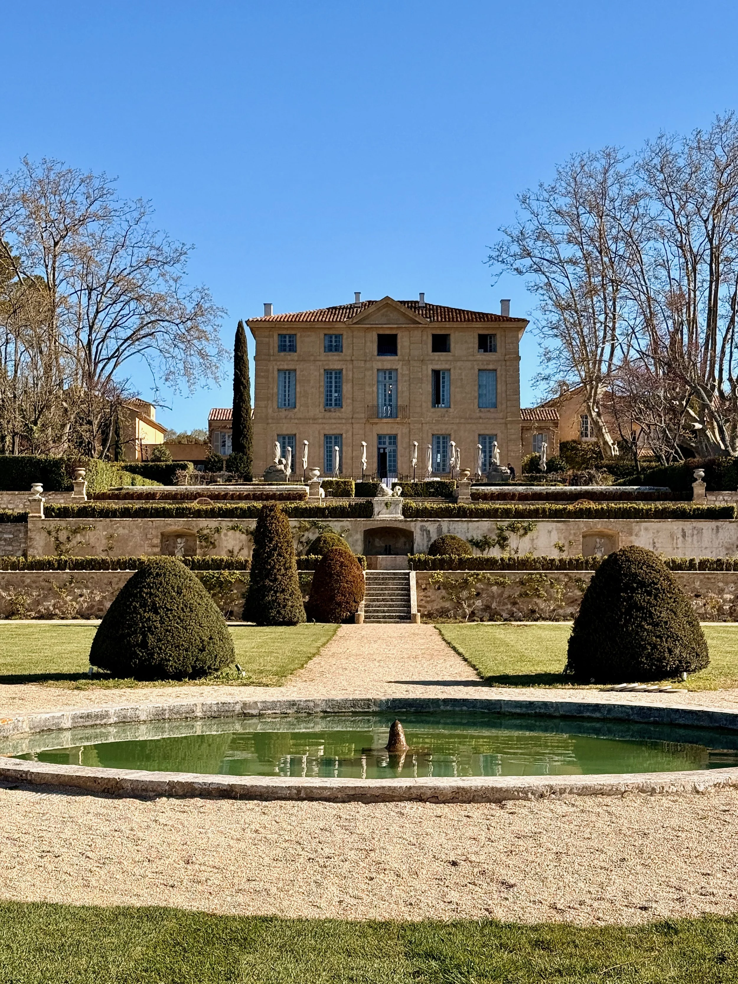 The property is extensive and brings together historic buildings, formal gardens, vineyards, a spa and a heated outdoor pool, which closes in the off-season. There is more than enough space to walk and explore without ever needing to leave the estate. Spring in Provence introduces a colour palette that works beautifully against both the landscape and the architecture.