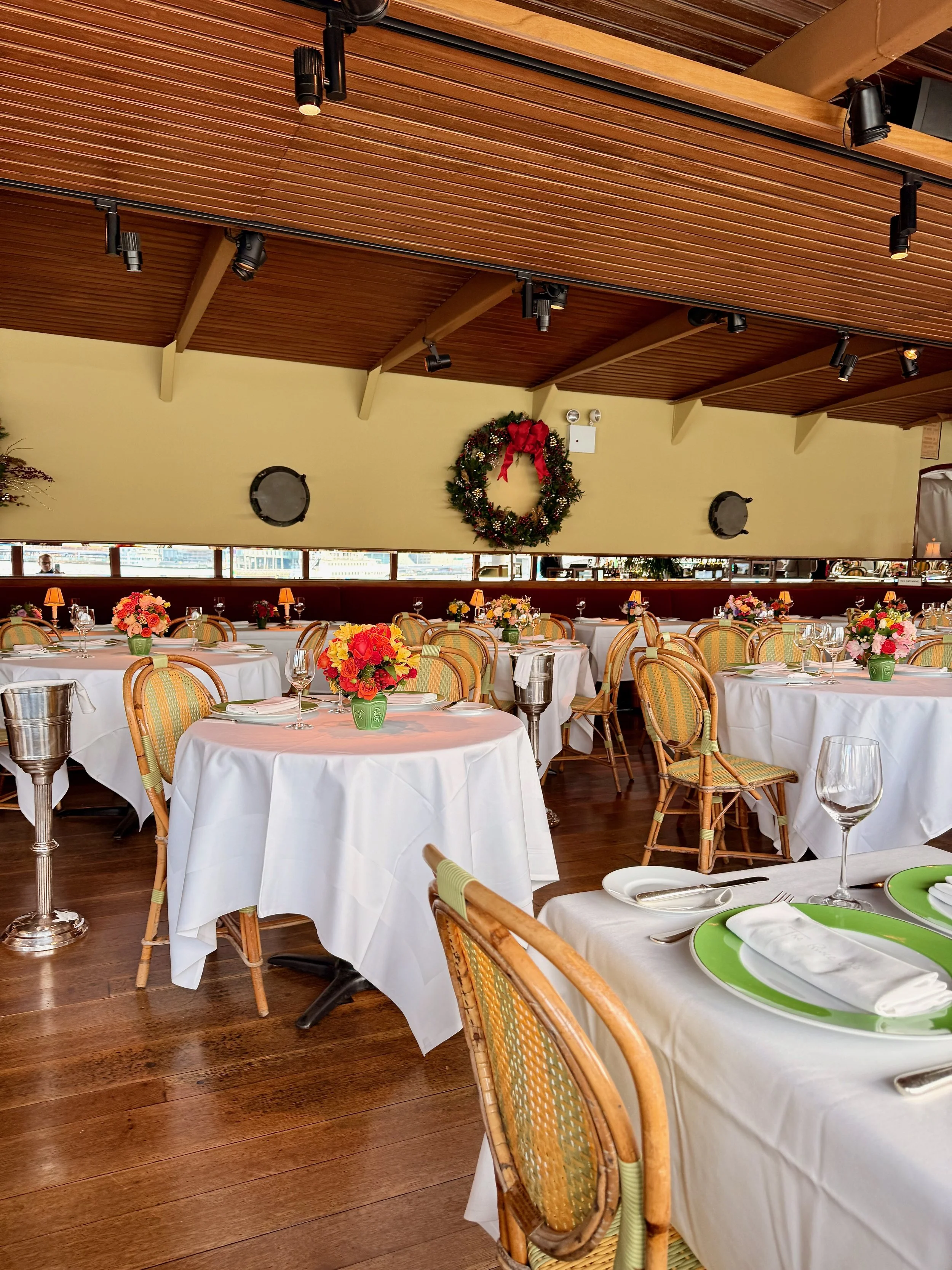 Image: Elegant tables at the River Café. © 2026 Palates & Miles
