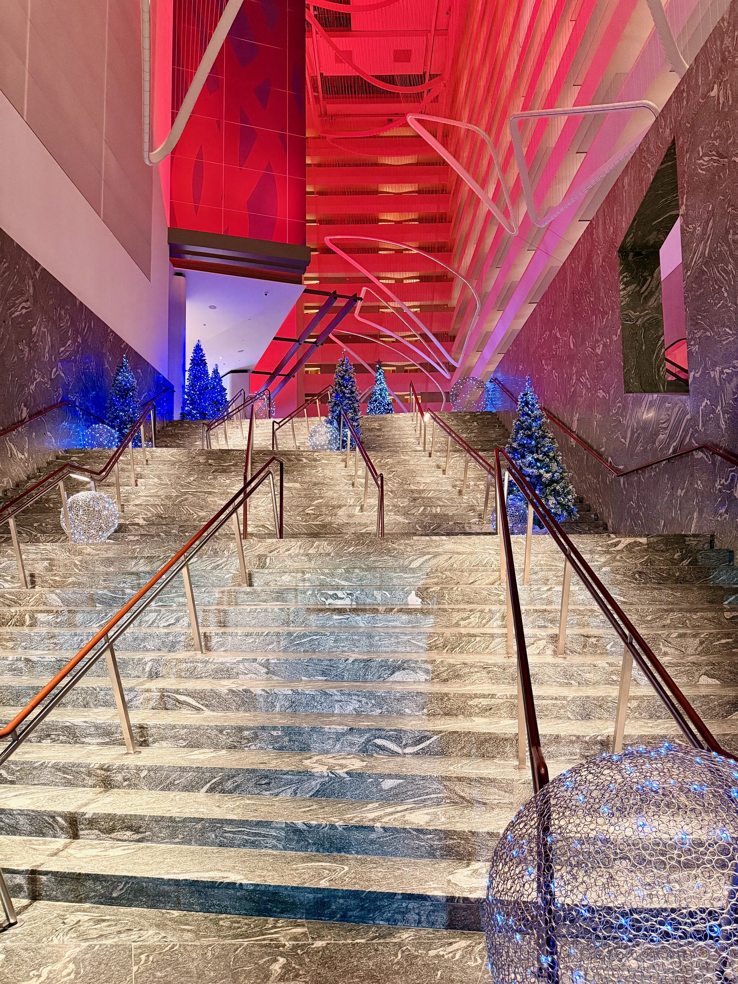 The lobby stairwell with the Christmas trees and bold lighting (pictured above) is also here. It is a small moment, but it sets the tone wonderfully. Downtown can still do festive at scale, without becoming loud or frantic.